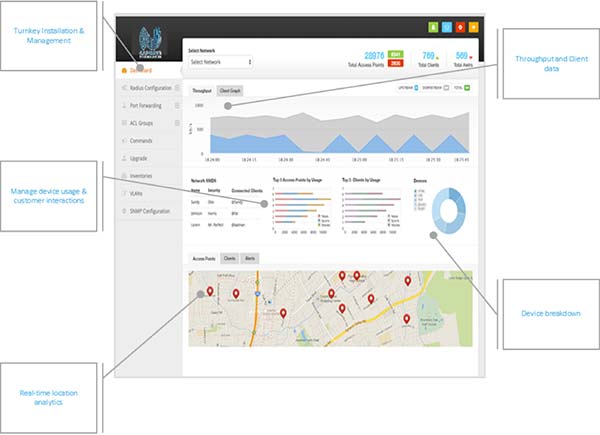 The Cloud controller is designed for intuitive web based dashboard Access Point (AP) and Customer Premise Equipment (CPE) management. It allows for Inventory and Assignment of devices on the network, configuration and management of SSIDs and VLANS. The Cloud controller can also be used to manage network upgrades and payload configurations.